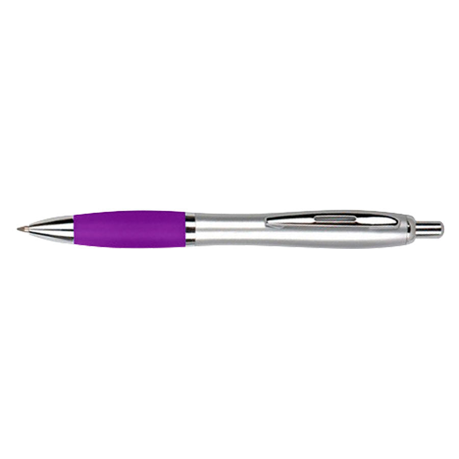 Diseño elegante y moderno: cuerpo plástico plateado, grip de goma a color para mayor comodidad y una escritura azul que fluye como el viento, ideal para eventos, promociones o simplemente para que tu marca quede en todas las manos.