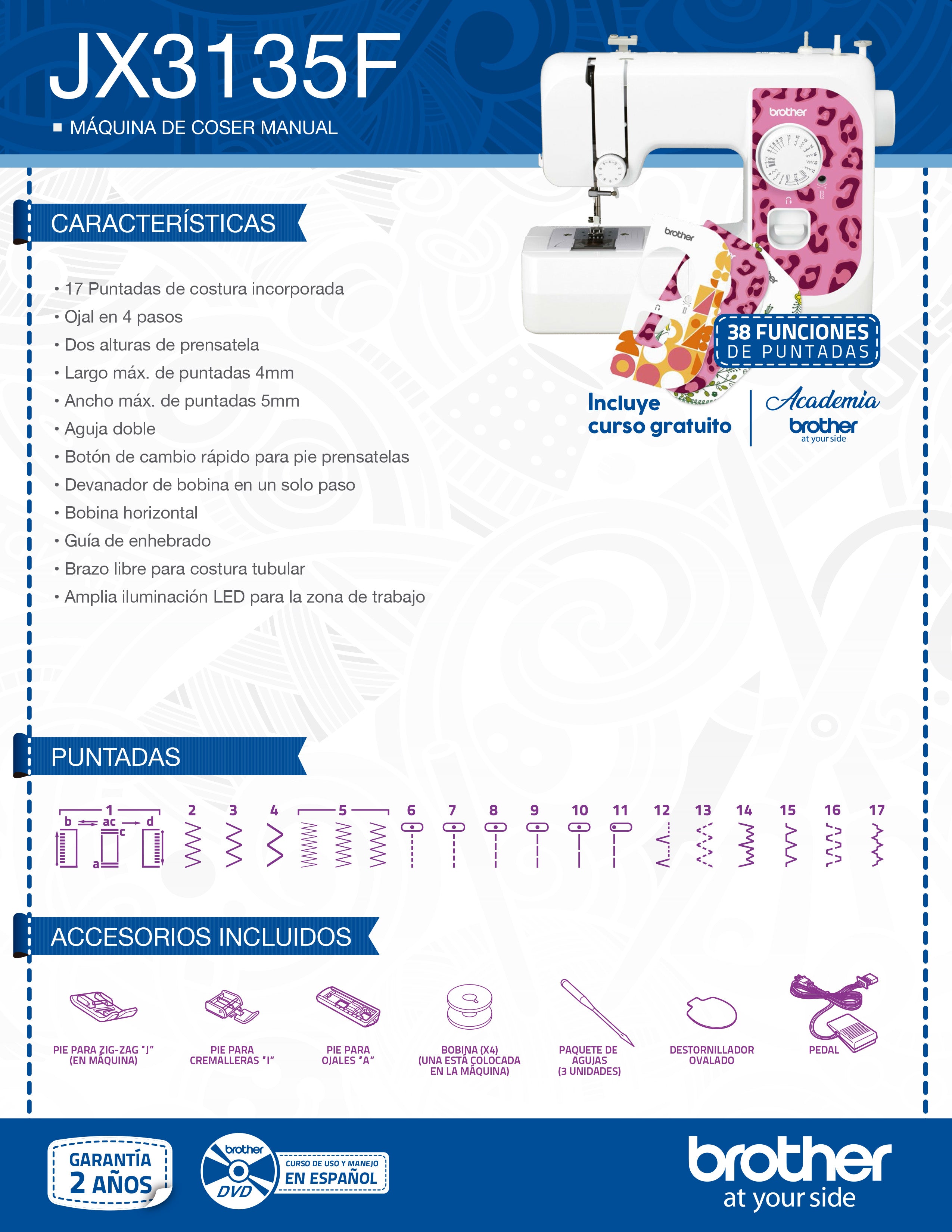 Personaliza tu Brother JX3135F, la única máquina en el mercado que te permite elegir entre 3 diseños diferentes que se adaptan a tu estilo. Es perfecta para aquellos que desean iniciarse en el mundo de la costura. Es una máquina liviana que puede ser transportada a cualquier lugar. Con 17 puntadas incorporadas, podrás realizar aplicaciones inigualables. Cuenta con luz LED para mejor visibilidad y ahorro de energía, ojal a 4 pasos y mucho más. Con la JX3135F de Brother podrás expandir tu creatividad para realizar incontables proyectos en tu hogar.